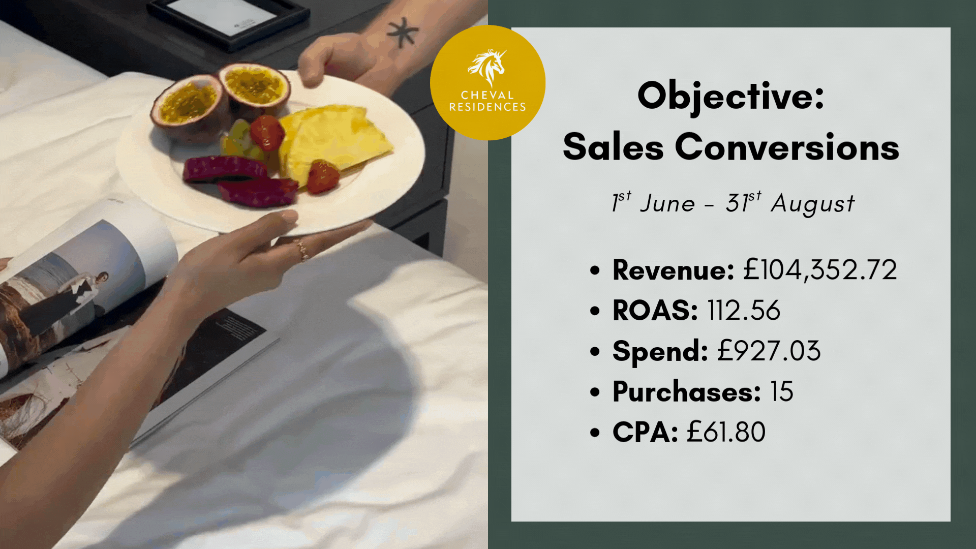 At Buddy Media, I led paid social campaigns for Cheval’s luxury hotels and residences. Across a summer series, we focused on driving conversions by targeting affluent business travelers and families seeking premium holiday experiences. Through precise audience segmentation and creative optimisation, we achieved an impressive ROAS, proving the power of tailored messaging and performance-driven strategy in the luxury travel space.